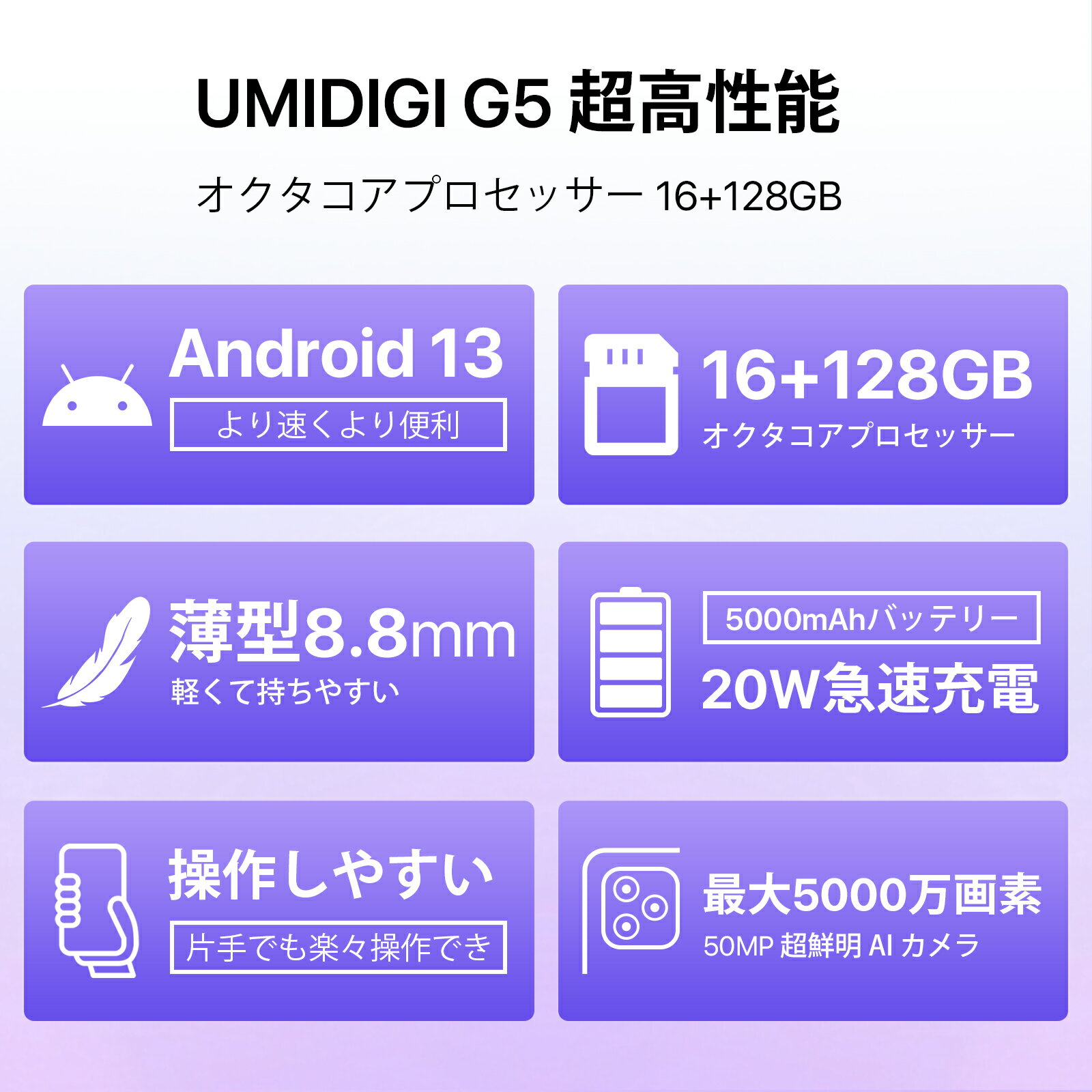 UMIDIGI G5 スマホ 16GB RAM+128GB ROM 1TBまで拡張 Android 13 スマートフォン 本体 simフリー 6.6インチ 90Hzリフレッシュレート 5000万画素メインカメラ|5000mAhバッテリ-|顔認証|指紋認証|GPS|OTG 携帯電話