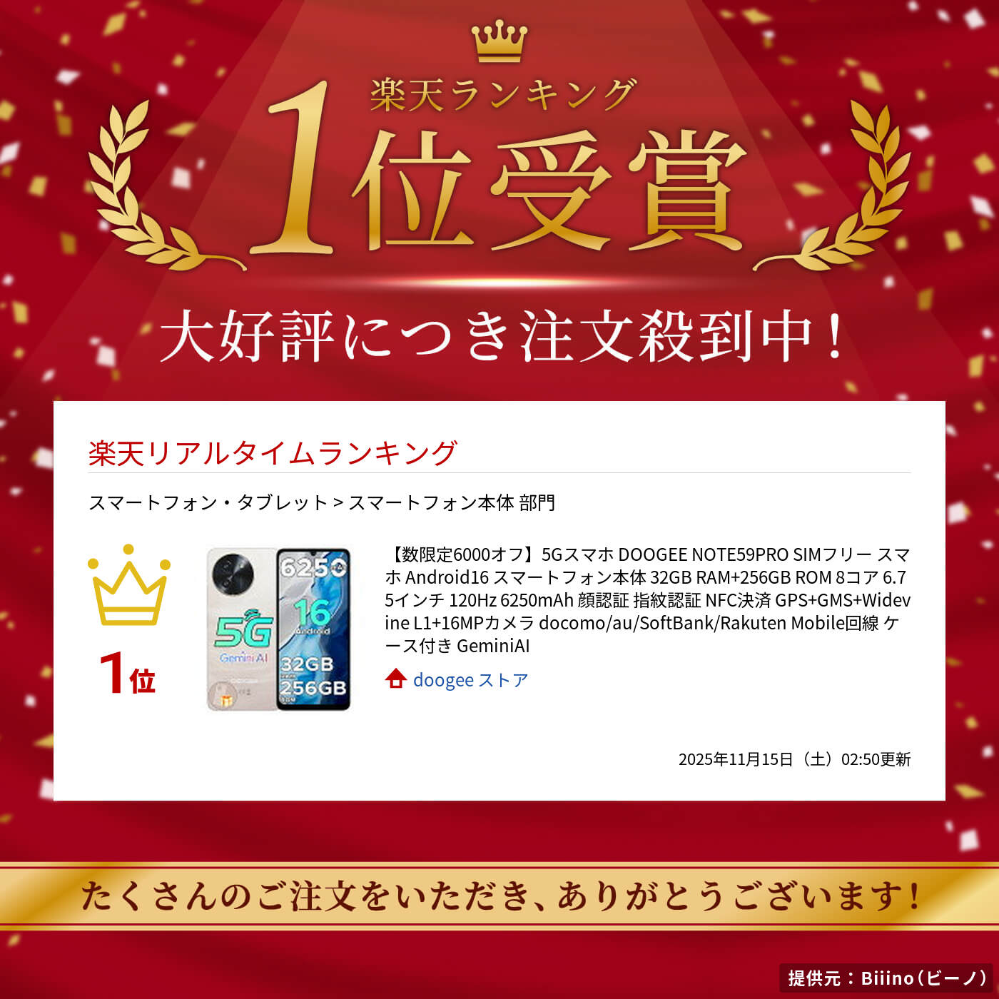 【数限定6000オフ】5Gスマホ DOOGEE NOTE59PRO SIMフリー スマホ Android16 スマートフォン本体 32GB RAM+256GB ROM 8コア 6.75インチ 120Hz 6250mAh 顔認証 指紋認証 NFC決済 GPS+GMS+Widevine L1+16MPカメラ docomo/au/SoftBank/Rakuten Mobile回線 ケース付き GeminiAI