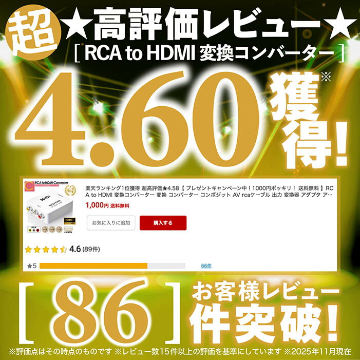 楽天ランキング1位獲得 超高評価★4.60【 プレゼントキャンペーン中!1000円ポッキリ! 送料無料 】RCA to HDMI 変換コンバーター 変換 コンバーター コンポジット AV rcaケーブル 出力 変換器 アダプタ アダプター 変換アダプタ PS1 PS2 SFC Wii N64 TV ゲーム機
