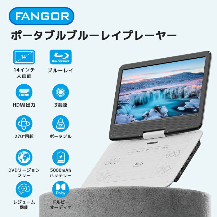 ポータブルブルーレイプレーヤー FANGOR 14インチ16.3型 HDMI出力対応 高精細1366*768TFT液晶画面270度回転 CPRM 5000mAhバッテリー内蔵3時間連続再生 車載可能 日本語取扱説明書 ホワイトBR142WHFANGOR