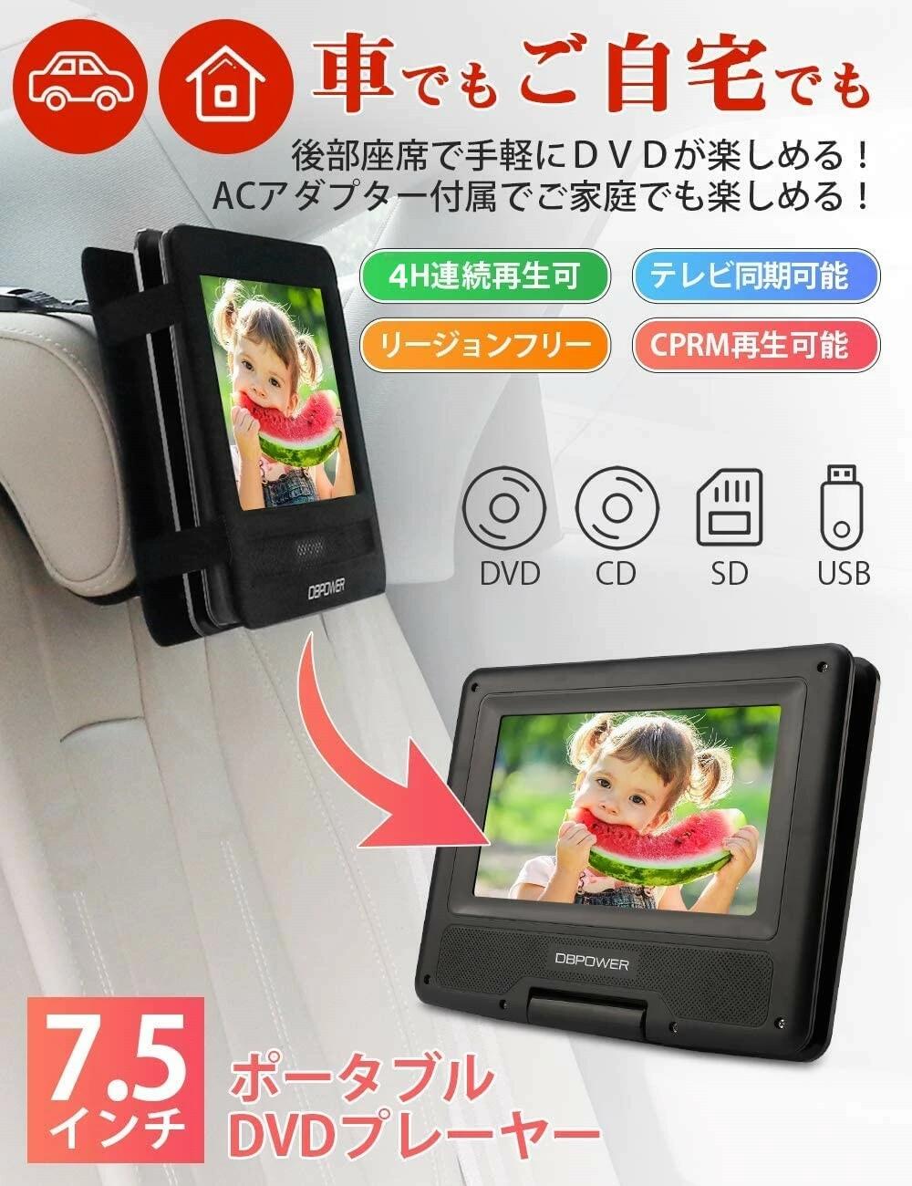 DBPOWER ポータブルDVDプレーヤー 7.5インチ 車載 最大4時間再生 3電源対応 レジューム機能 270度回転 リージョンフリー CPRM対応 TVと同期可能 SD/MS/MMCカード/USBに対応 【メーカー1年保証】