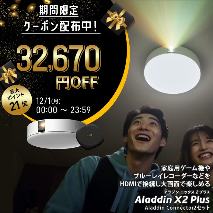 【期間限定32,670円OFFクーポン発行中】Aladdin X2 Plus HDMI コネクター2セット アラジン エックス2 プラス 大画面でゲームやブルーレイを楽しもう ワイヤレスHDMI プロジェクター売上No.1 短焦点 LEDシーリングライト スピーカー フルHD 900 ANSIルーメン