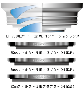 4K画質対応、ワイド(広角)コンバージョンレンズ0.79x HDP-7880ESワイドコンバージョンレンズは 未使用の時と比べさらに27%広い画角での撮影が可能になります。 大口径3群3枚光学ガラスを使用した新設計により中心解像力335 本/mm(MTF30%での設計値) の高解像力を実現!4Kワイドマスターレンズ、デジタル、ハイビジョンカメラ対応の 高品位ワイドコンバージョンレンズです。 付属品...