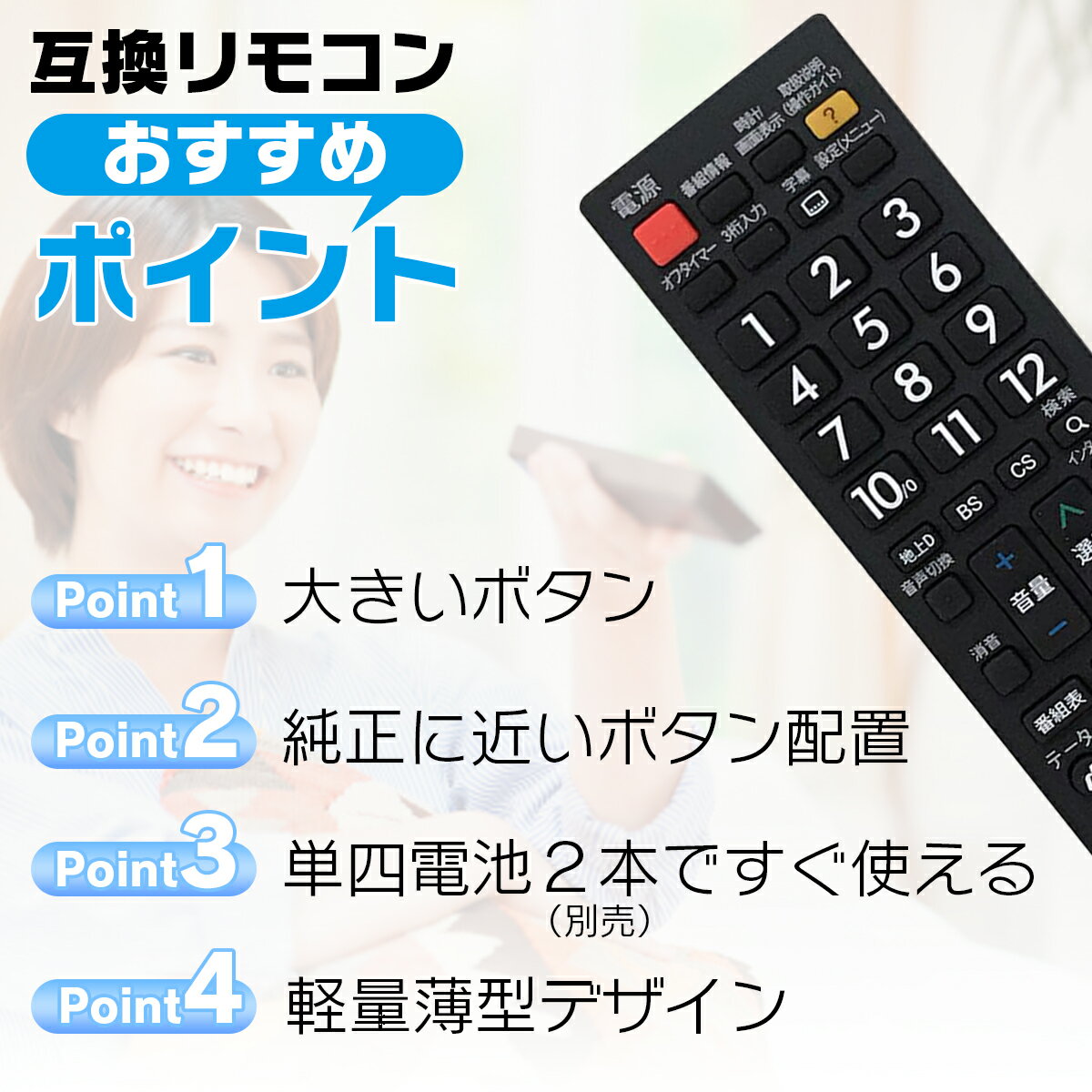 簡易リモコン ●純正リモコンの全機能を網羅し、軽くて使いやすい。 対応機種 ●32V30 / 40V30 / 32V31 / 40V31 / 43G20X / 49G20X / 55G20X / 40M500X(K) / 40M500X(W) / 50M500X / 58M500X / 43C310X / 49C310X / 43J10 / 49J10 / 55J10 対応。 操作しやすい ●この...
